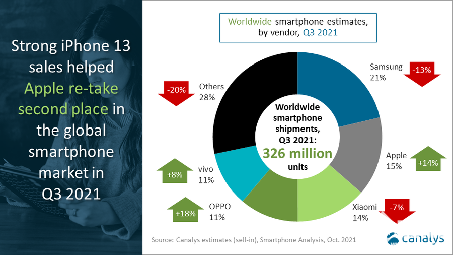 【PChome手机频道报道】据市场研究机构Canalys公布的最新数据显示,2021年Q3季度全球手机市场出货3.25亿部,相比2020年Q3季度同比下降6%,全球手机市场的再次萎缩,很大程度上是由于全球芯片短缺的情况造成的,使得本应全面复苏的全球手机市场反复横跳。