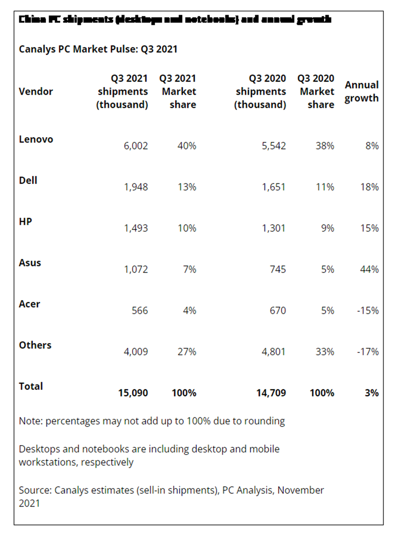 近日,知名市场调查机构Canalys发布了第三季度中国PC市场出货报告,三季度国内PC总出货量超过1500万台,和去年同期相比增长了3%,其中包括笔记本、台式机等产品品类。