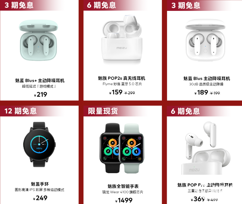 配件方面,魅族POP2s真无线耳机原价299元,双12期间159元;魅蓝Blus主动降噪耳机原价199元,双12期间189元;魅族POP Pro主动降噪耳机原价499元,双12期间369元,购买还享受6期免息。此外,魅蓝手环售价249元,购买可以享受12期免息,四舍五入不要钱。
