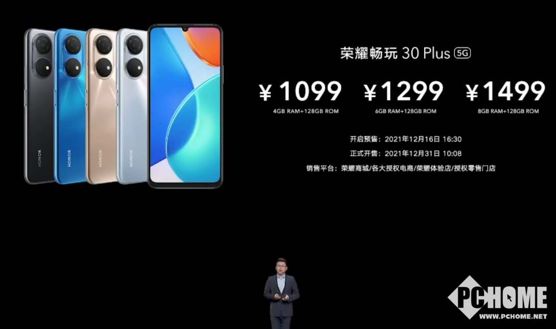 在荣耀X30新机之外,荣耀畅玩系列5G新品荣耀畅玩30 Plus也正式发布。该机配备22.5W超级快充、5000mAh大电池、6.74英寸高刷大屏、128GB大存储,支持5G双卡双持、侧边指纹等功能,提供幻夜黑、钛空银、晨曦金、魅蓝海4种配色,售价1099元起,12月16日16:00开启预售,12月31日10:08在荣耀商城、各大授权电商平台及荣耀线下门店正式开售。