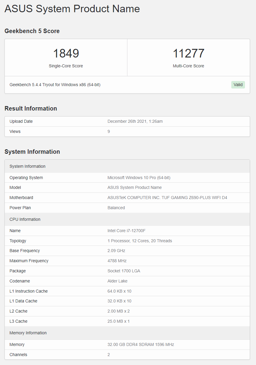 近日,Intel Core i7-12700F处理器又在Geekbench 5跑分网站上曝光,处理器采用8大核4小核设计,拥有12核心24线程,三级缓存为25MB。测试平台采用了华硕 TUF GAMING Z690-PLUS WIFI D4主板、32GB DDR4内存。