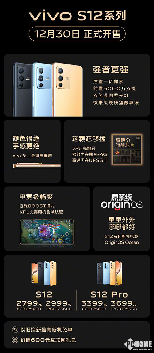 【PChome手机频道资讯报道】影像、性能、设计全面升级全面出色的vivo S12系列,今天0点正式开售了,从目前的情况来看,vivo S12、S12 Pro的所有版本和颜色均保证现货在售,无需抢购。与此同时,参与首销用户还可享受免息、原厂无线耳机、延保等福利。