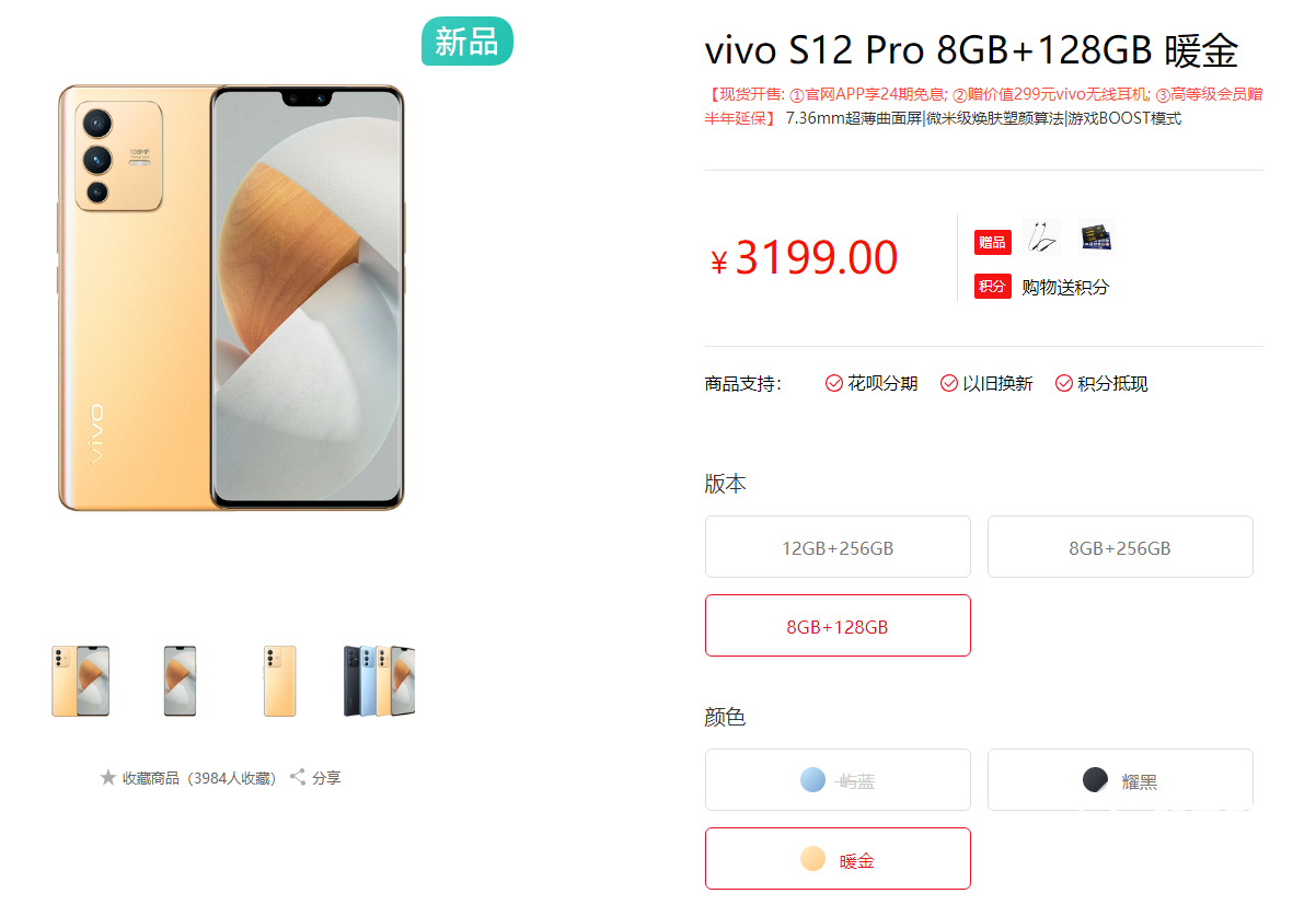 配色方面,vivo S12系列提供暖金、屿蓝、耀黑三款配色,其中8GB+128GB版提供暖金、耀黑两个配色,另外两个容量则是全部颜色均可选择。