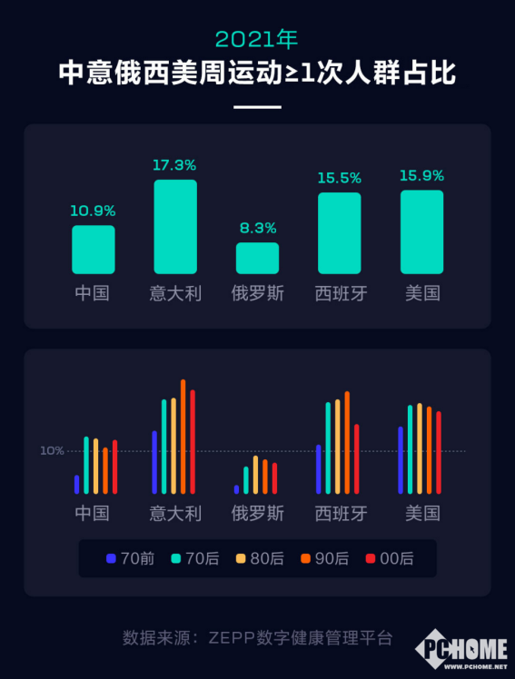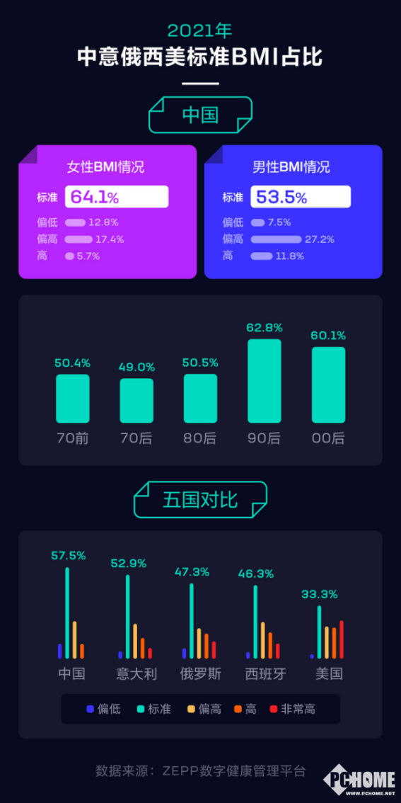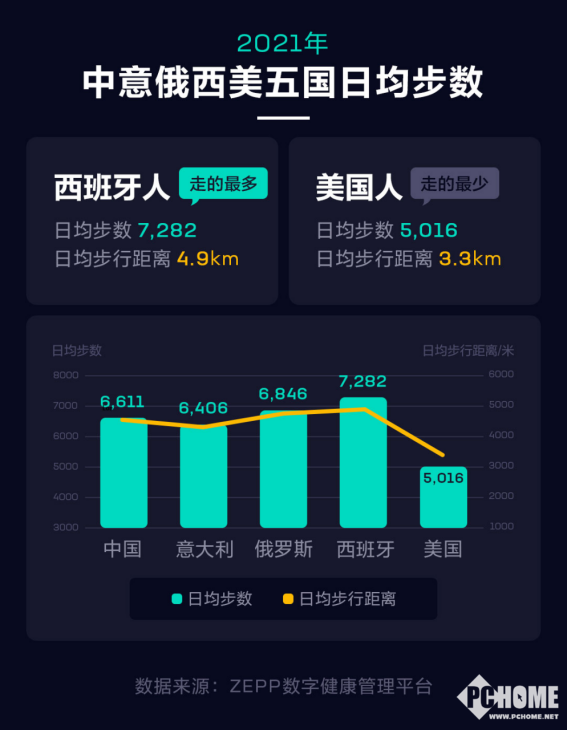 近日,华米科技发布了《2021年中国人健康状况报告》,报告由华米科技ZEPP数字健康管理平台对公司旗下智能可穿戴设备采集获得的步数、睡眠、BMI、运动、压力指标等数据进行分析解读,全面展示了2021年国人的身体运动健康情况,并且本次报告对西班牙、意大利、美国、俄罗斯四个国家也同步进行了分析,以便让更多的人衡量对比自身健康状况,了解自己所在国家的总体健康水平。