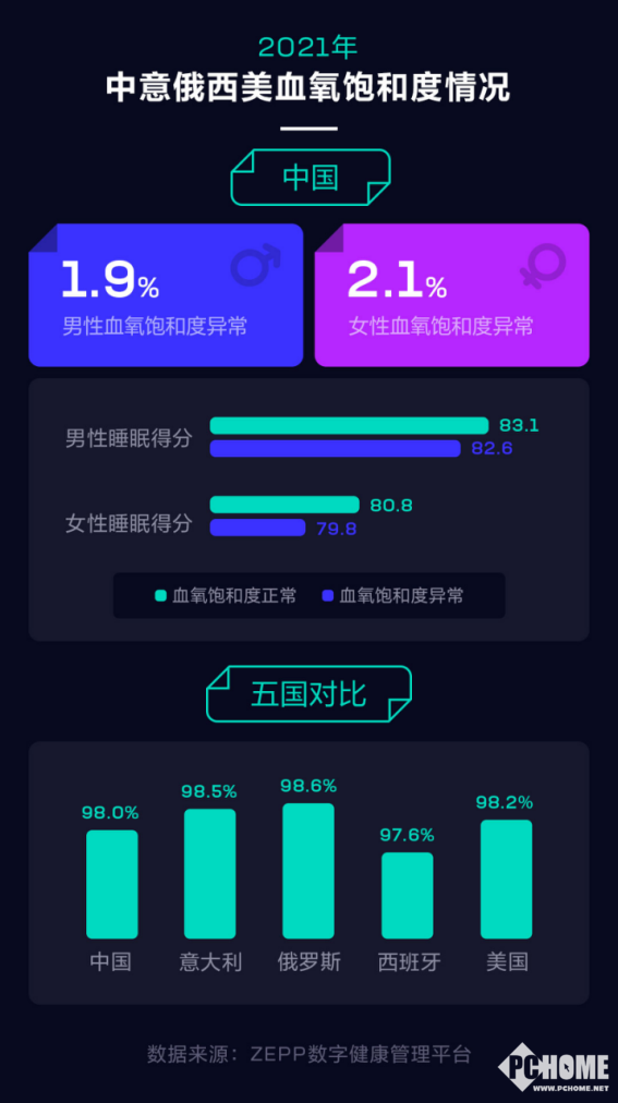 血氧饱和度是呼吸循环的重要生理指标,本次报告数据显示,血氧饱和度正常的人群睡眠得分显著高于异常人群,在中国人中有2%的人存在血氧饱和度异常情况,其中血氧异常情况男性比女性略少,但差距仅为0.2%。其他各国中,血氧饱和度处于正常范围值占比最高的是俄罗斯人,西班牙人最低。