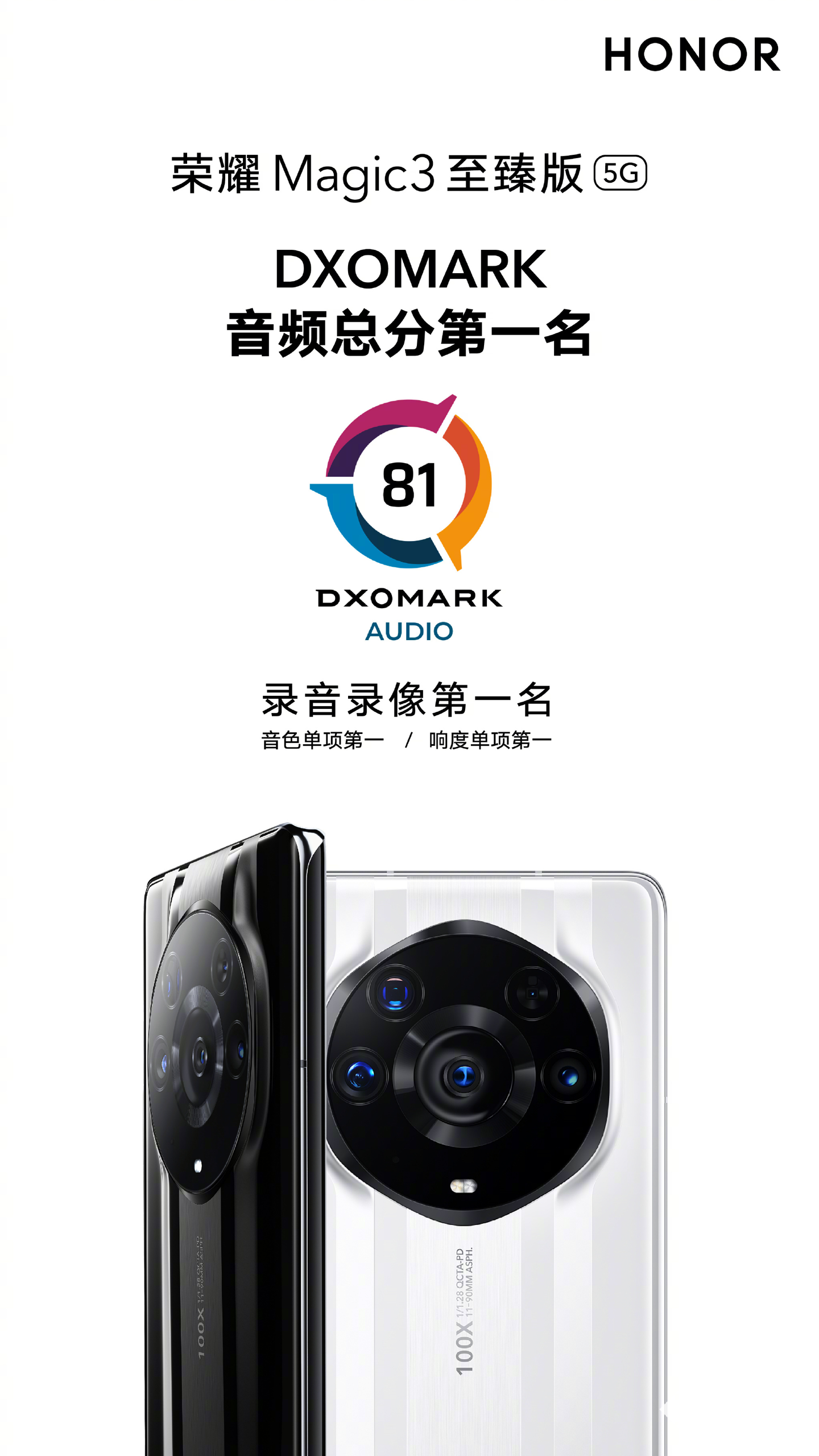 评测机构DxOMark发布的音频榜单中,荣耀Magic3 至臻版获得总分第一名。