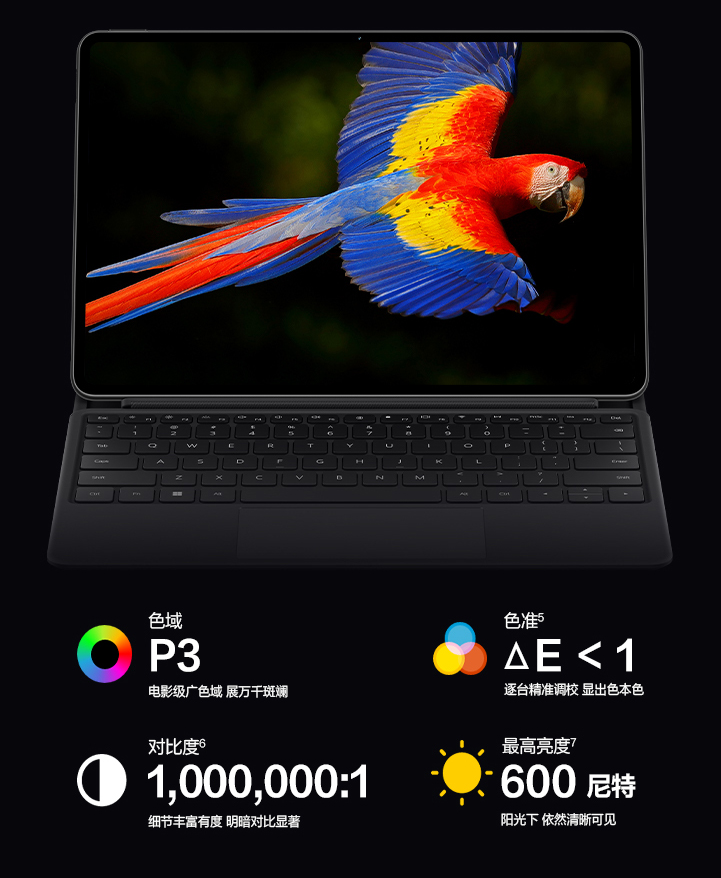 华为MateBook E首次在二合一笔记本产品线使用OLED显示屏,可以带来更加出色的色彩显示效果、更高的亮度和对比度。屏幕覆盖了100% DCI-P3色域,色准△E小于1,同时对比度高达1000万:1,屏幕亮度高达600尼特。平时办公、观影可以获得更加出色的视觉体验,即使执行一些内容创作任务也不在话下。