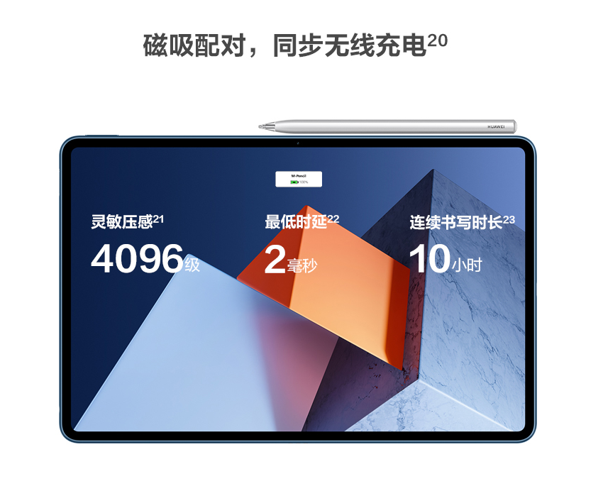 华为MateBook E支持第二代HUAWEI M-Pencil,该手写笔支持4096级压感,延迟时间低至2ms,书写时间长达10小时,可以让你脑海中的创意尽情挥洒。