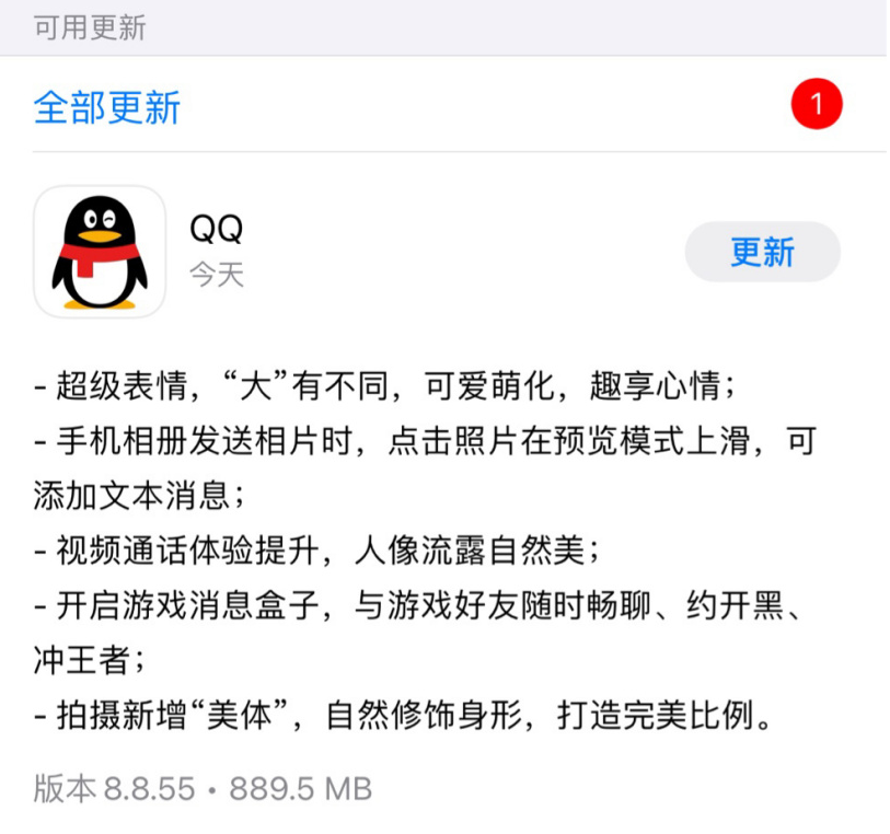 近日,手机QQ迎来8.8.55版本升级,苹果应用商店显示,iOS的QQ安装包体积达到了惊人的879MB。
