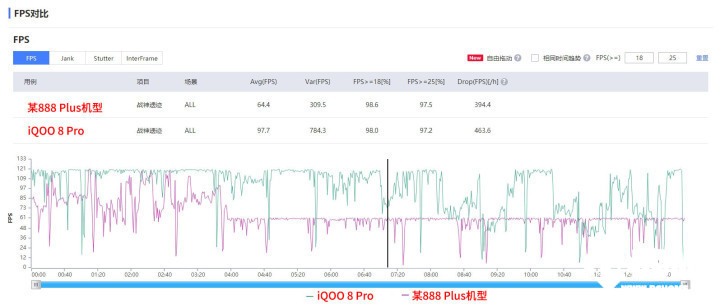 在支持VRS技术的游戏《战神遗迹》中,使用采用骁龙888 Plus移动平台的iQOO 8 Pro在开启VRS功能后,平均帧数达到97.7帧。另一款同样采用骁龙888 Plus的手机手动关闭VRS模式,则由于芯片负载太高发热严重,被系统锁定到了 60帧,最终全程平均帧数仅有64.4帧。显然VRS技术能够对游戏流畅性进行极大的改善,并显著降低处理器负载,减少发热量提高游戏续航时间。