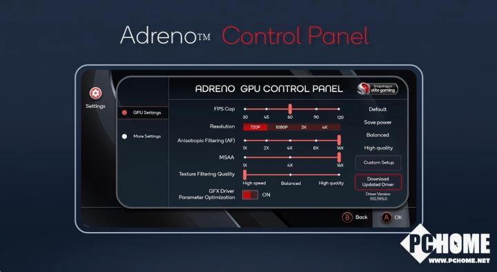 Adreno控制面板对游戏进行自定义的选项调节,在控制面板中可以直接进行最新版本的驱动下载更新,这方面是越来越像PC端了。