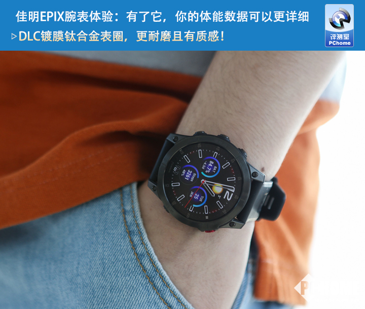 除了屏幕质感不错之外,EPIX户外腕表在材质方面也可圈可点。其采用DLC镀膜钛合金表圈,更加耐磨防剐蹭;按键采用了PVD镀膜金属材质,按键更加亮眼,还会增加使用寿命。