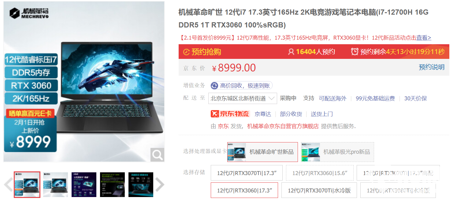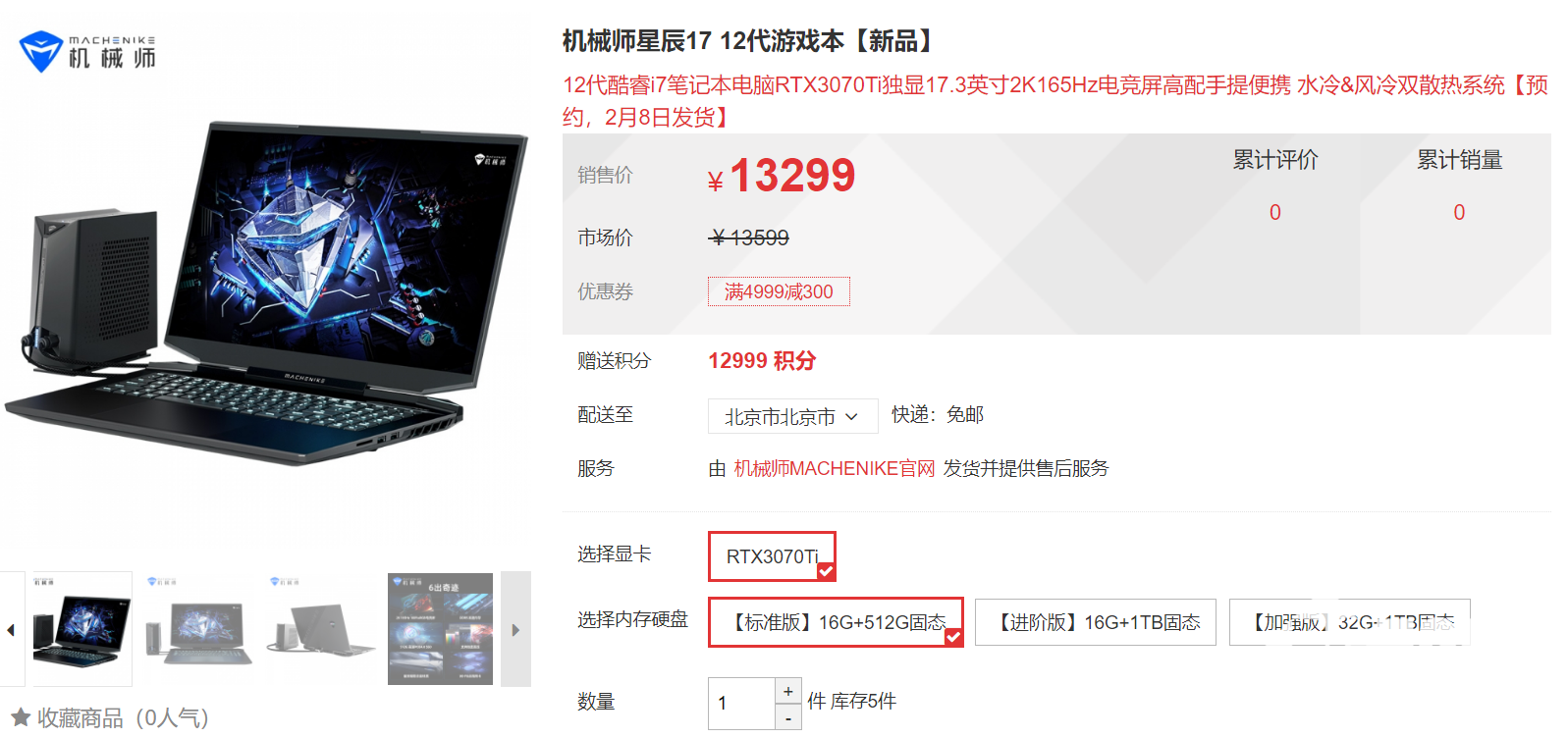 目前机械师星辰17水冷版已经在机械师官方网站开启预售,提供三个存储配置版本,16GB内存+512GB固态硬盘售价13299元,16GB内存+1TB固态硬盘售价13799元,32GB内存+1TB固态硬盘售价14399元。将于2月8日发货,感兴趣的小伙伴可以前往了解更多详情。