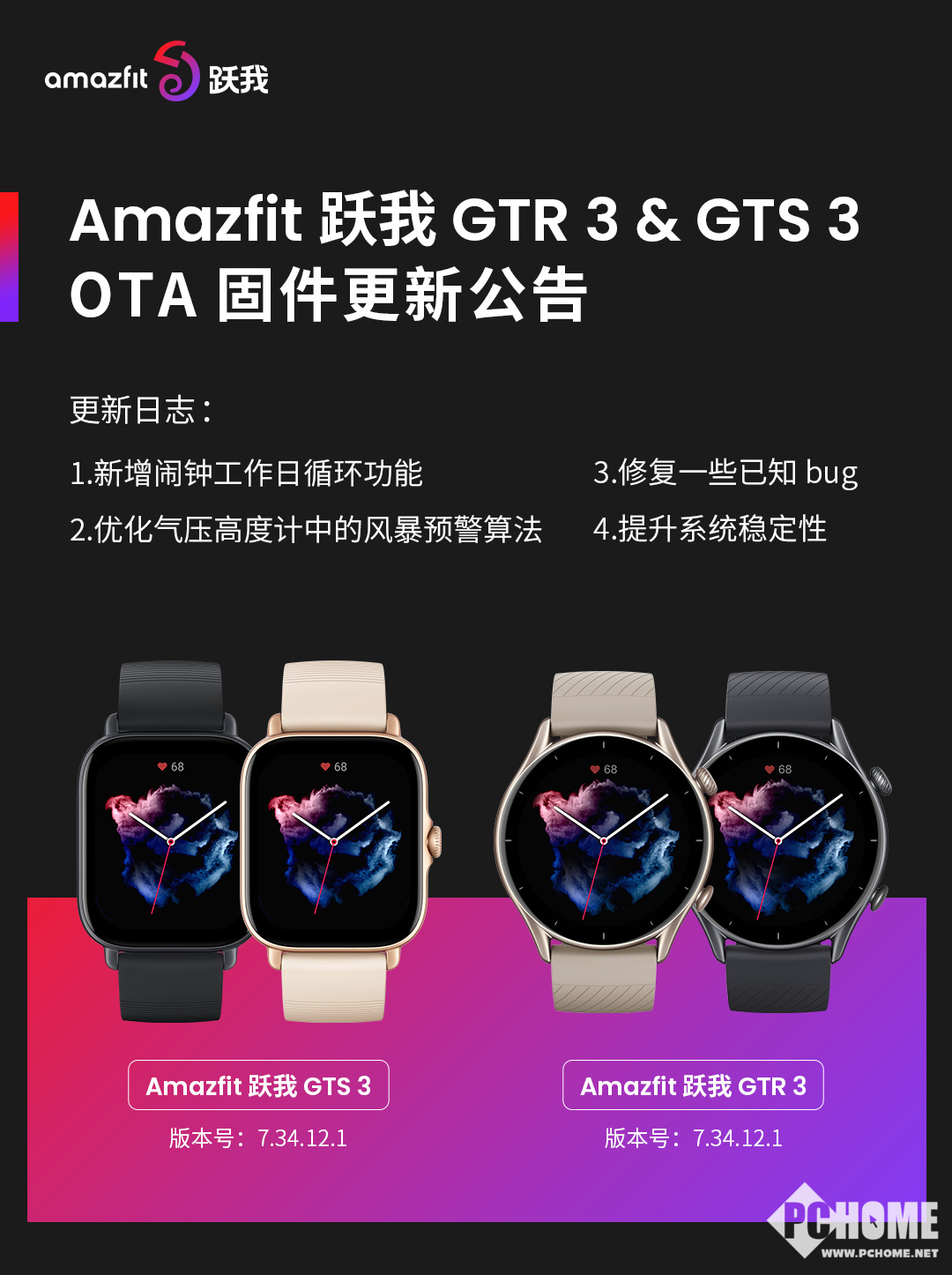 除此之外,Amazfit跃我GTR 3 Pro还新增了工作日闹钟循环功能、优化网易云音乐下载稳定性、优化气压高度计中的风暴预警算法并进行bug修复以及稳定性提升。Amazfit跃我GTR 33和GTS 3则新增工作日闹钟循环功能、优化气压高度计中的风暴预警算法并进行bug修复及稳定性提升。