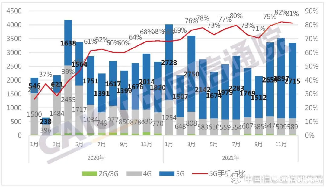 不过4G手机的需求还是要分市场来看,国内市场中5G手机是绝对的主力机型,根据工信部方面的信息显示,截至2021年底,全国5G基站数超过了140万,5G网络已覆盖全部的地级市,覆盖超过98%的县城城区和80%的乡镇镇区。全国5G手机的出货量达到了2.66亿部,同比增长了63.5%,出货量占比高达75.9%,5G终端用户达到4.5亿户,占全球80%以上。