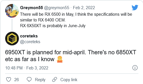 在CES2022期间,AMD公布了使用RDNA 2架构的移动版RX 6000系列新品显卡,不过并未提及桌面本产品。根据爆料达人@Greymon55的消息,AMD将在今年的6/7月份公布RX 6000系列的50XT加强版本,也就是采用增强版RDNA 2架构(RDNA 2 Refreshed)的RX 6X50XT产品。