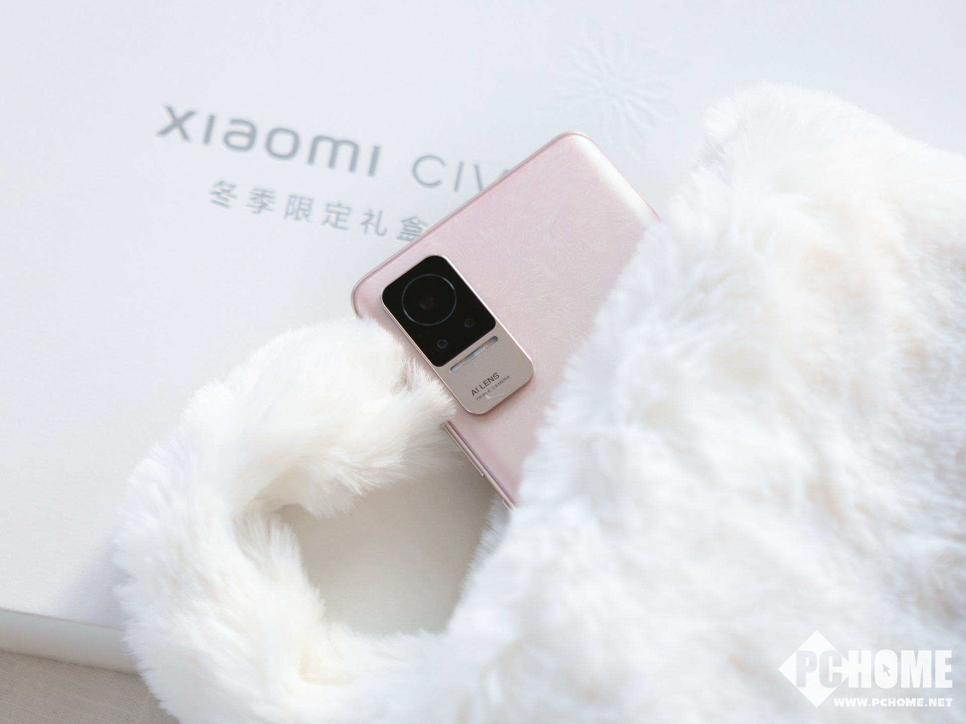 小米Civi周边礼盒中包含白色的毛绒手机壳、白色毛绒手提包以及怦怦球挂链,相信很多女生会对这种毛绒质感的东西爱不释手。
