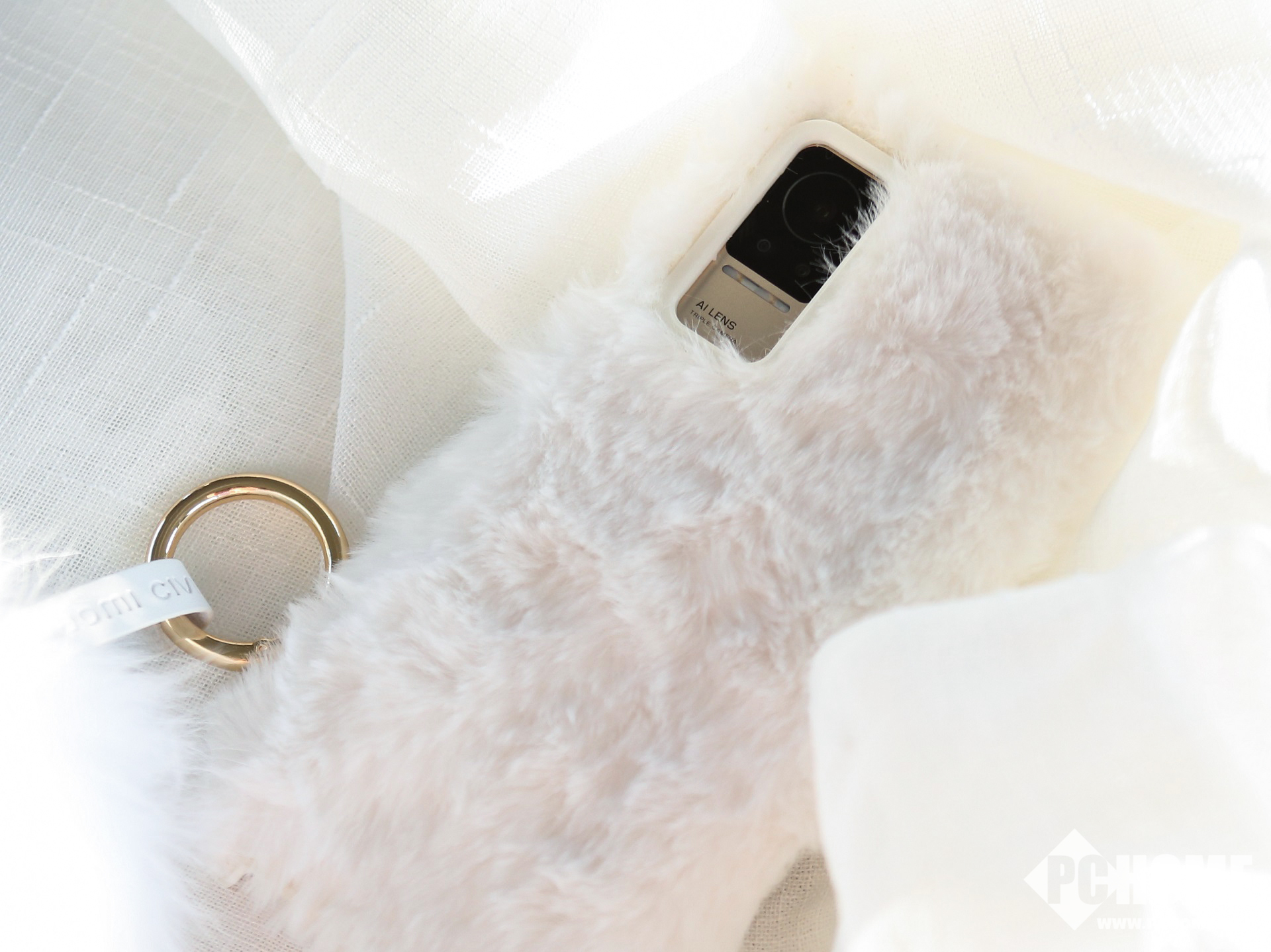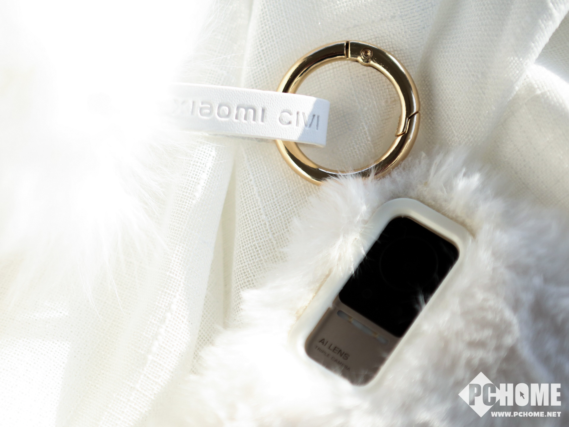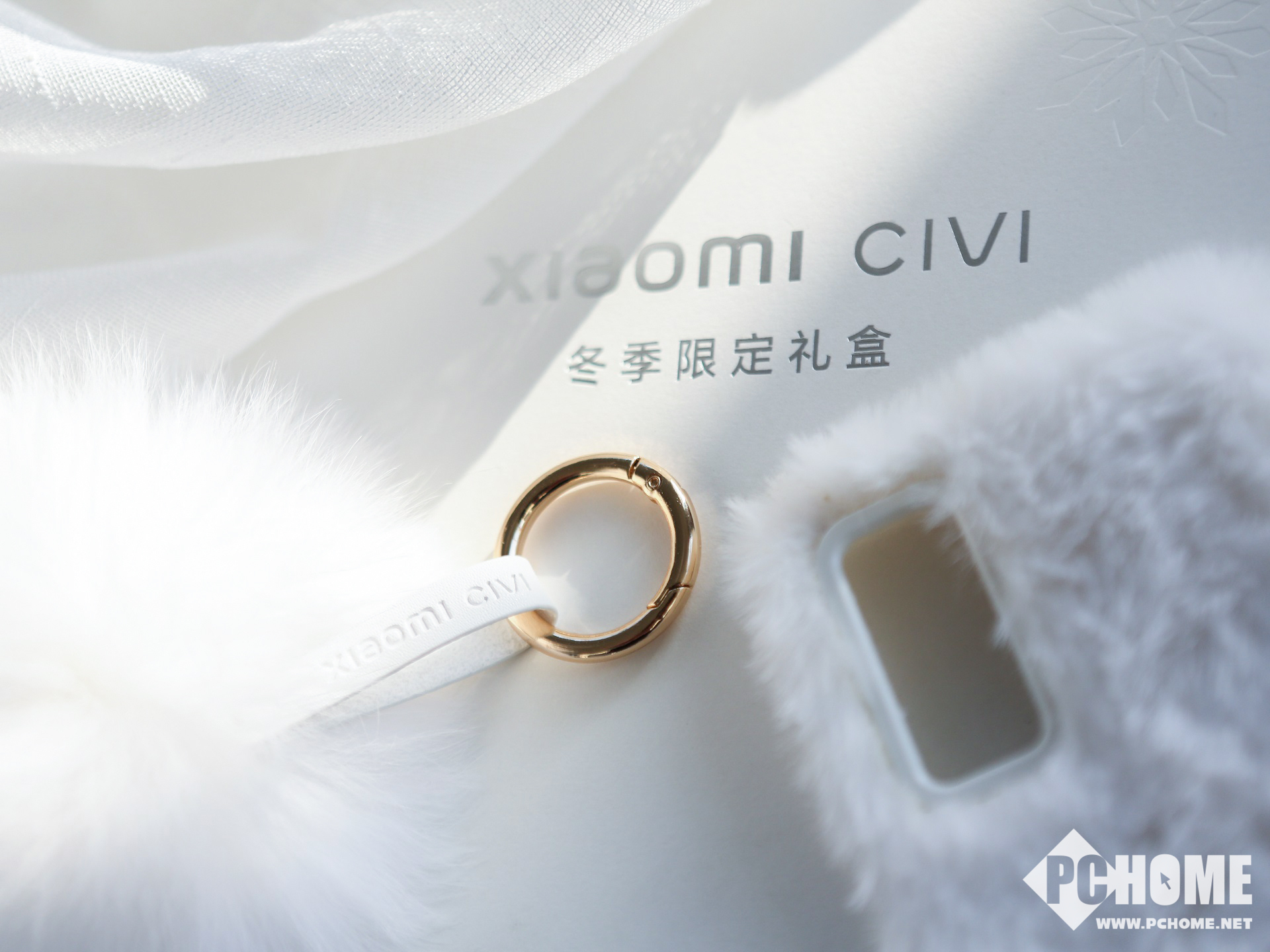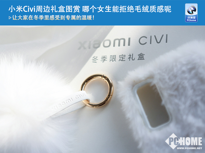 小米Civi周边礼盒中包含白色的毛绒手机壳、白色毛绒手提包以及怦怦球挂链,相信很多女生会对这种毛绒质感的东西爱不释手。