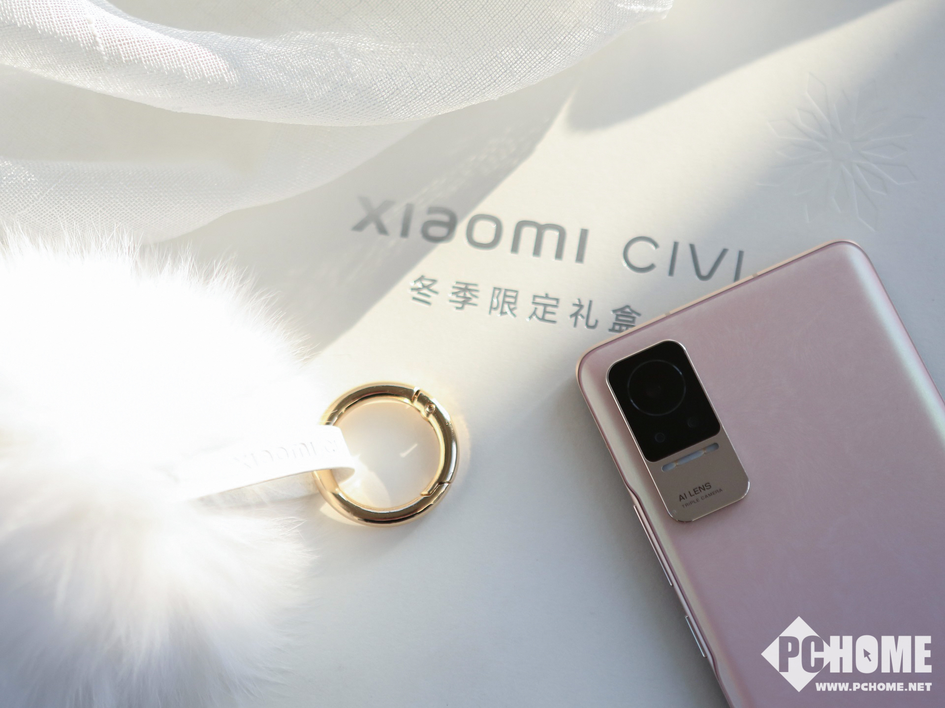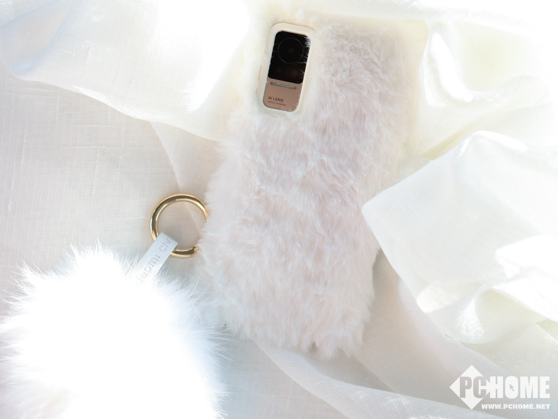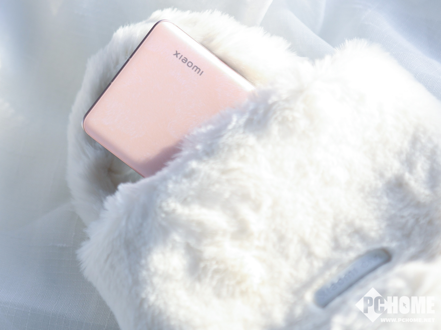 小米Civi周边礼盒中包含白色的毛绒手机壳、白色毛绒手提包以及怦怦球挂链,相信很多女生会对这种毛绒质感的东西爱不释手。