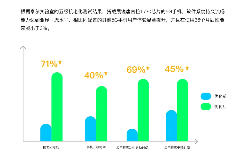根据泰尔实验室的五级抗老化测试结果,搭载展锐唐古拉T770芯片的5G手机,软件系统持久流畅能力达到业界一流水平,相比同配置的其他5G手机,用户体验显著提升:抗老化指标提升71%,手机开机时间快40%,应用程序的冷热启动时间快69%,应用程序安装时间快45%,并且在使用36个月后性能衰减小于3%。