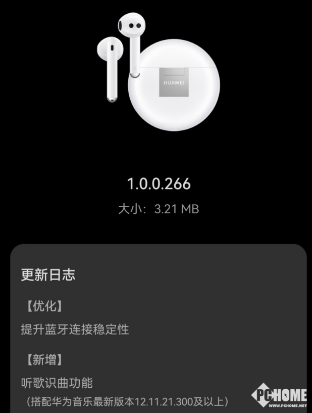 近日消息,华为FreeBuds 4真无线耳机推送了1.0.0.266固件更新,新增了听歌识曲功能,还优化了蓝牙连接稳定性。