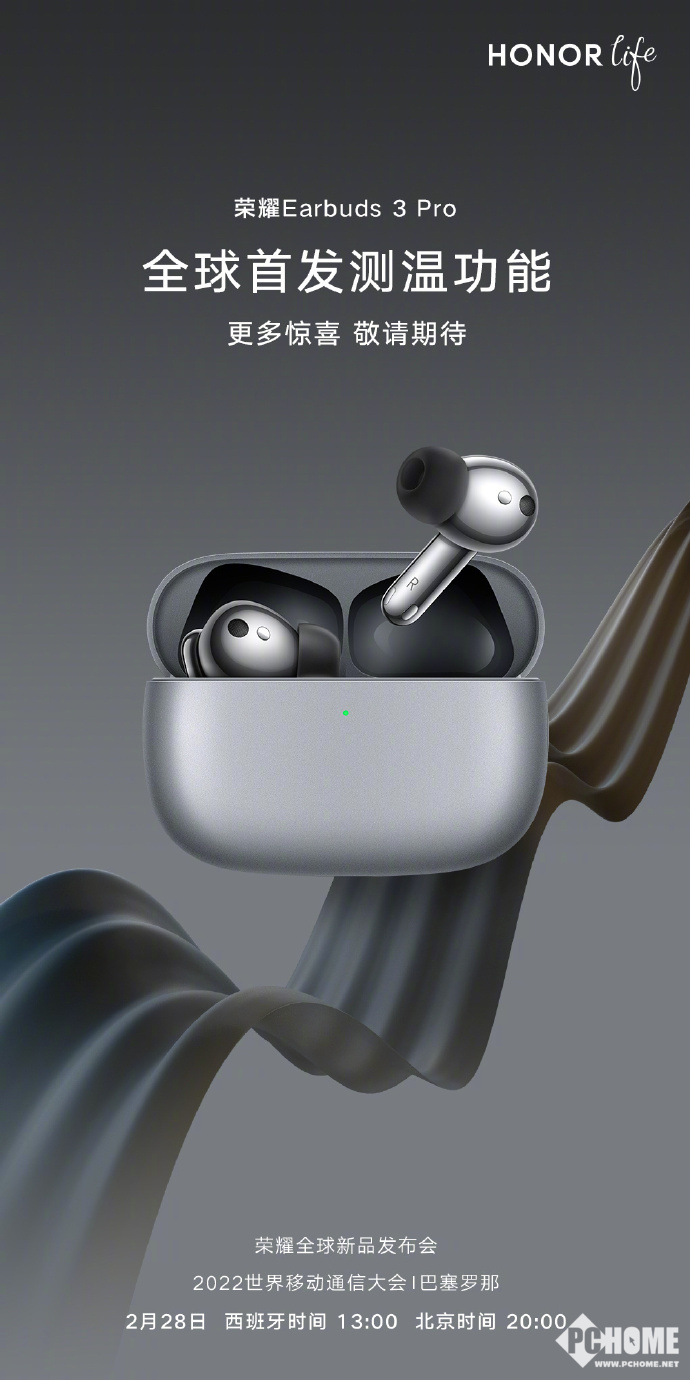2月17号消息,荣耀智慧生活官宣全球首款测温真无线耳机——荣耀耳机Earbuds 3 Pro即将在2月28日正式发布。