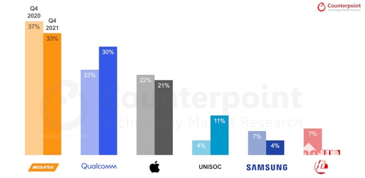联发科虽说依然保持着第一的市场份额,但同比出现了4%的下滑,33%的市场份额与高通的差距已经非常小了。高通方面则由于5G芯片的强势表现,获得了30%的市场份额。苹果完全自产自销的A系列处理器,则没有明显的市场份额变化。