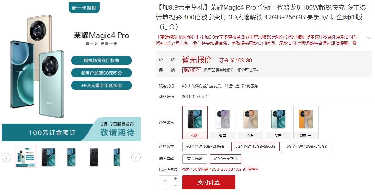 与此同时,荣耀Magic4系列在荣耀官网开启了预订活动,参与订金预订将获赠机场贵宾厅权益,老用户还能享受50元积分卡,加9.9元还能享受荣耀提供的半年延保活动。另据预订页面显示的信息,参与订金预订的用户补足尾款的时间大概在4月上旬,具体的支付时间调整将会通过短信提醒。