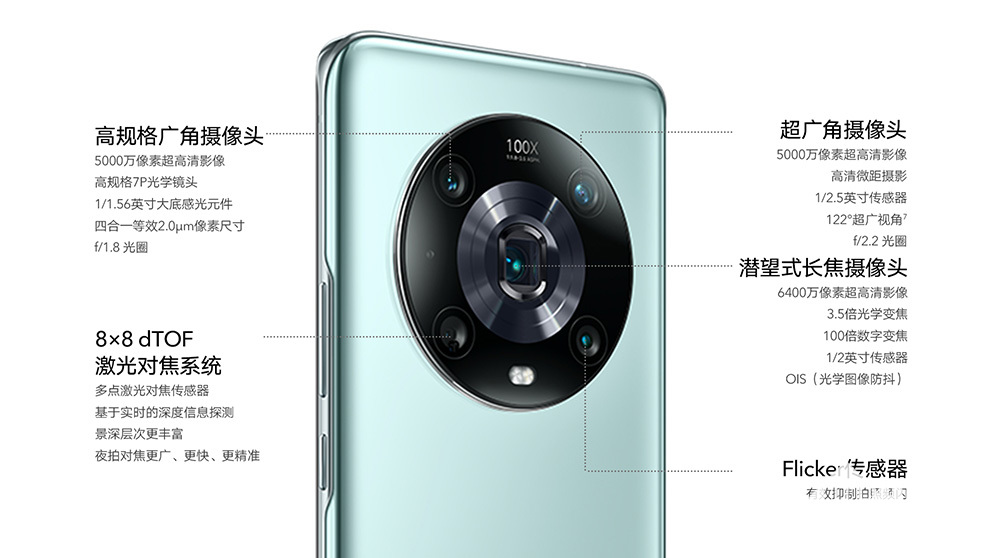 荣耀Magic4 Pro搭载5000万像素大底主摄、5000万像素超广角摄像头和6400万像素潜望式长焦摄像头,还有8x8 dToF激光对焦传感器和Flicker传感器,用以提升暗光条件下对焦的速度和色彩准确度。提供全焦段场景支持,提供3.5X光学变焦、10X混合变焦、100X数字变焦。在不同焦段中启用不同的多颗镜头进行融合,大幅度的提升画面中央的清晰度表现。在视频拍摄上,联手好莱坞专业影像团队,精心调制了多个电影级的3D LUTs,能调出更丰富的色调。