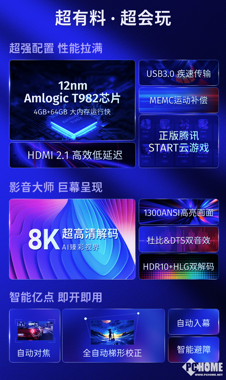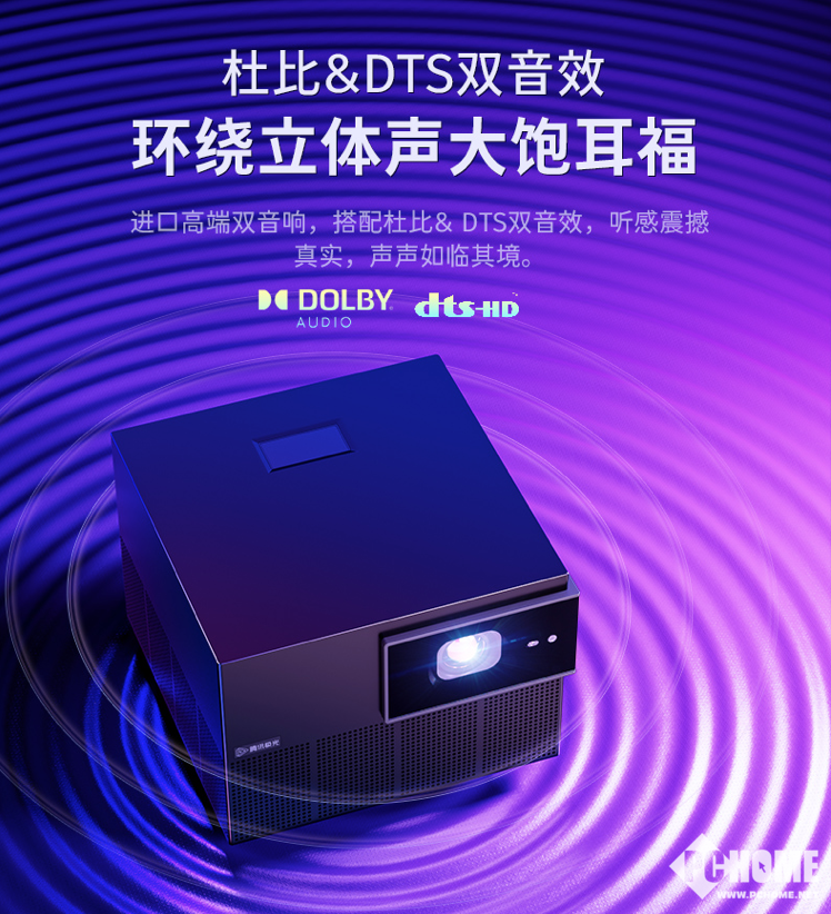 腾讯极光投影P2支持1080P投射屏幕,投射亮度方面为1300ANSI流明亮度,日常暗场使用的话还是足够的。采用了Amlogic T982 12nm芯片,支持4K/8K内容解码。同时这枚芯片还支持MEMC运动补偿,能够提供流畅的画面效果。配合腾讯AI臻彩视界则可以根据不同的画面场景AI智能匹配不同的画质色彩,带来相对不错的画面观感。声音方面则支持杜比&DTS双音效,提供极具沉浸感的声音包裹。