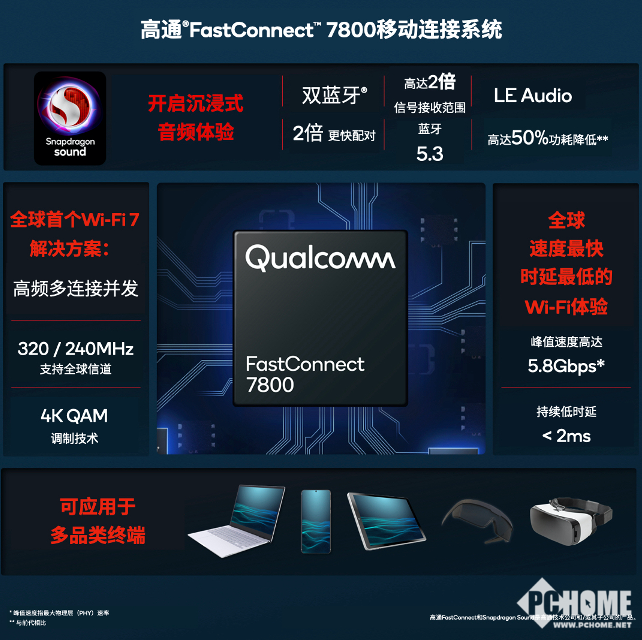 与此同时,高通还推出了全球业内最先进的Wi-Fi和蓝牙连接系统——FastConnect 7800。这款先进的客户端连接方案支持最新的Wi-Fi 7规范,带来高速网络与超低时延Wi-Fi,并支持一系列蓝牙音频先进特性,以满足消费者对于音质的更高期待。FastConnect 7800凭借高频多连接并发(High Band Simultaneous Multi-Link)技术引领整个行业,该顶级特性面向Wi-Fi 7网络,利用5GHz和6GHz Wi-Fi连接所带来的巨大潜能,提供极致容量和持续极低时延,同时面向蓝牙和低带宽Wi-Fi释放高度拥挤的2.4GHz频谱。