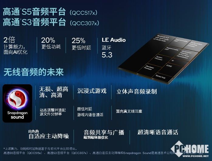 此外,高通还推出了两款具备丰富特性的全新超低功耗无线音频平台——高通S5音频平台(QCC517x)和高通S3音频平台(QCC307x),均支持Snapdragon Sound骁龙畅听技术。两款平台经过优化并支持双蓝牙模式,将传统蓝牙无线音频和全新LE Audio技术标准相结合。