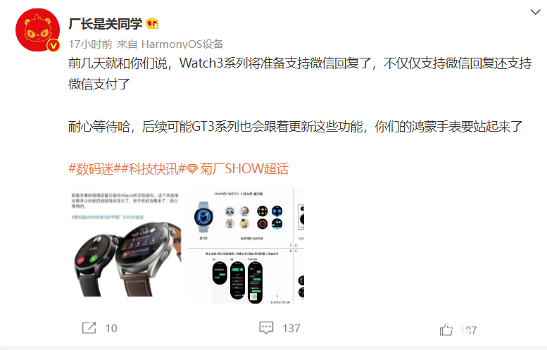 有数码博主爆料称华为Watch 3系列不仅即将支持微信回复消息功能,还将支持微信支付,让使用更加方便。该博主还表示,后续华为GT3系列也将支持这些功能。