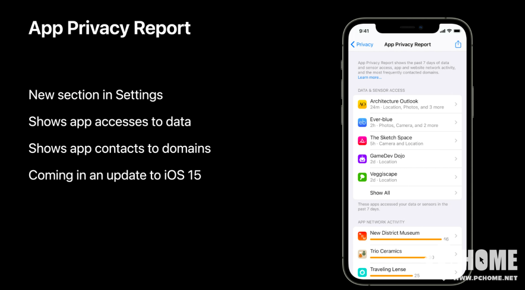 以苹果为例,其在iOS 15上,将iOS 14.5个人数据保护的主线正式推向了前台。其中“应用程序隐私报告”不光能让用户全面了解应用的隐私活动,更可以生成相应的文件,让用户进行审核,以确认应用程序的行为是否符合预期。对此,苹果表示:“你的应用程序应该只访问用户期望的数据,并在他们期望的时间访问。”
