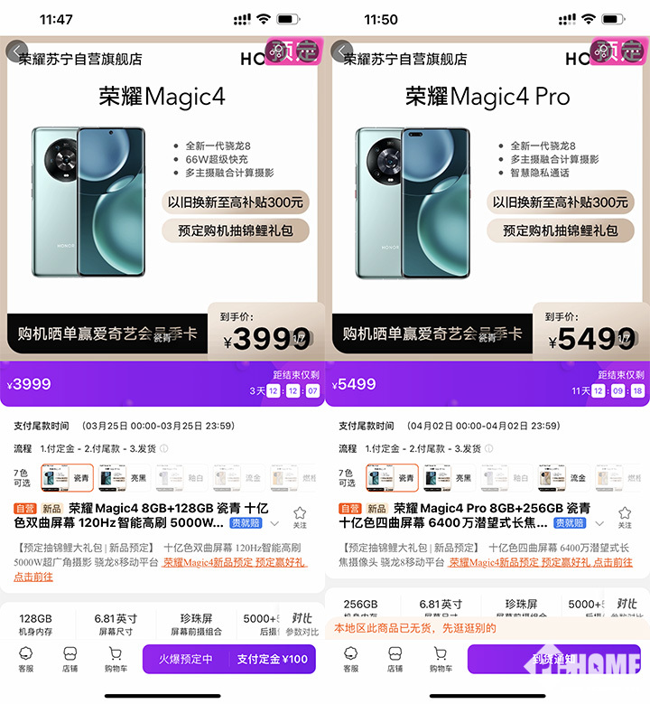 上周荣耀举行了新品发布会,正式公布Magic4系列国行版售价,其中Magic4起售价3999元、Magic4 Pro起售价5499元。目前荣耀苏宁自营旗舰店已经开启了定金预售,现在下定最快本周就能拿到手机。