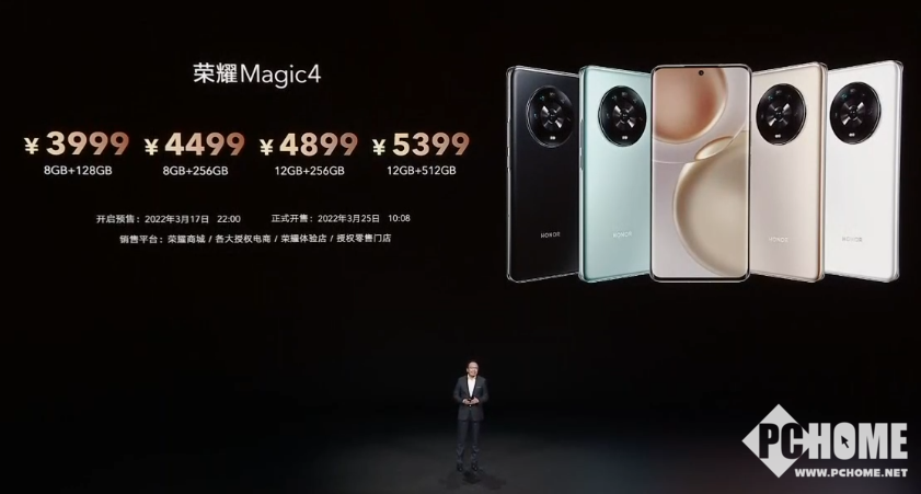 价格和开售时间方面,荣耀Magic4提供四个版本:其中8GB+128GB售价3999元、8GB+256GB售价4499元、12GB+256GB售价4899元、12GB+512GB售价5399元,开售时间是3月25日10点08分;而荣耀Magic4 Pro则提供三个版本:8GB+256GB售价5499元、12GB+256GB售价5899元、12GB+512GB售价6499元,开售时间为4月2日10点08分。