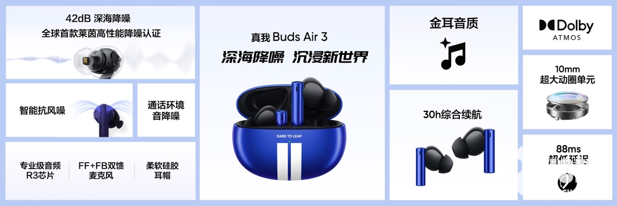 音质方面,realme特邀十年资深音频调教团队,为真我Buds Air3打造DBB复合低音强化方案,进一步发挥10mm超大动圈单元的实力,让低音澎湃有力、中高音弹性悦耳,带来更震撼的音乐体验。真我Buds Air3还支持杜比全景声,带来立体环绕的高品质音效。