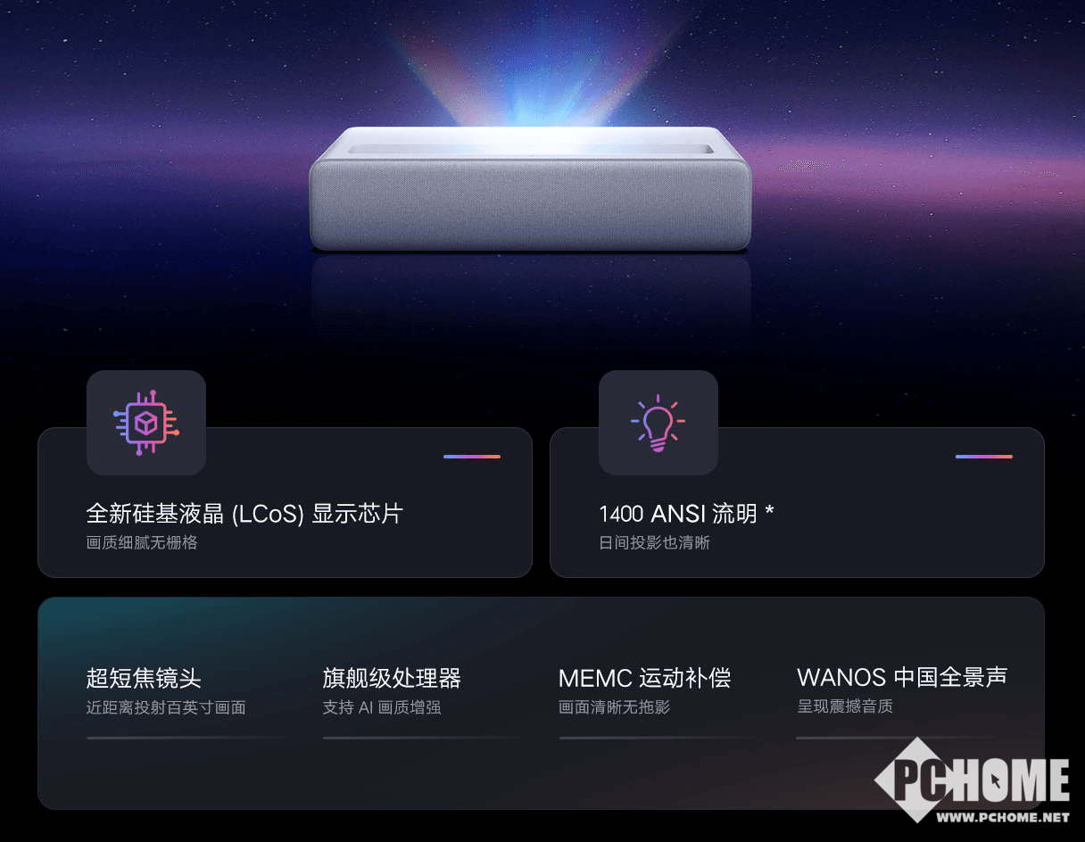 小米全色激光影院采用了RGB三色激光光源,去除了传统的色轮滤光结构,实现了95%的BT.2020色域覆盖,同时亮度方面达到了1400ANSI流明,让画面整体更亮、更艳丽。同时其还使用全新硅基液晶(LCoS)技术,使得像素之间无栅格状条纹阻挡画面,让画面观感更加的通透。内置的Amlogic T982四核心处理器支持Tone Mapping技术、Smooth+技术、AI SE技术以及AI画质增强技术,可以为投射画面带来全方位的提升,MEMC运动补偿技术则在高速运动场景中始终提供流畅的画面效果,AI PQ智能算法则通过AI识别能力识别天空、建筑、植物、人像等画面信息,针对性优化细节纹理与色彩调教,全方位提升画面表现力。