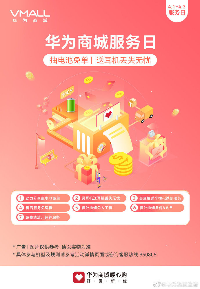 4月1号消息,华为智慧生活宣布华为商城服务日开启,在4月1号至4月3号之间可以享受买耳机送耳机丢失无忧、买耳机送个性化镌刻服务等等福利。