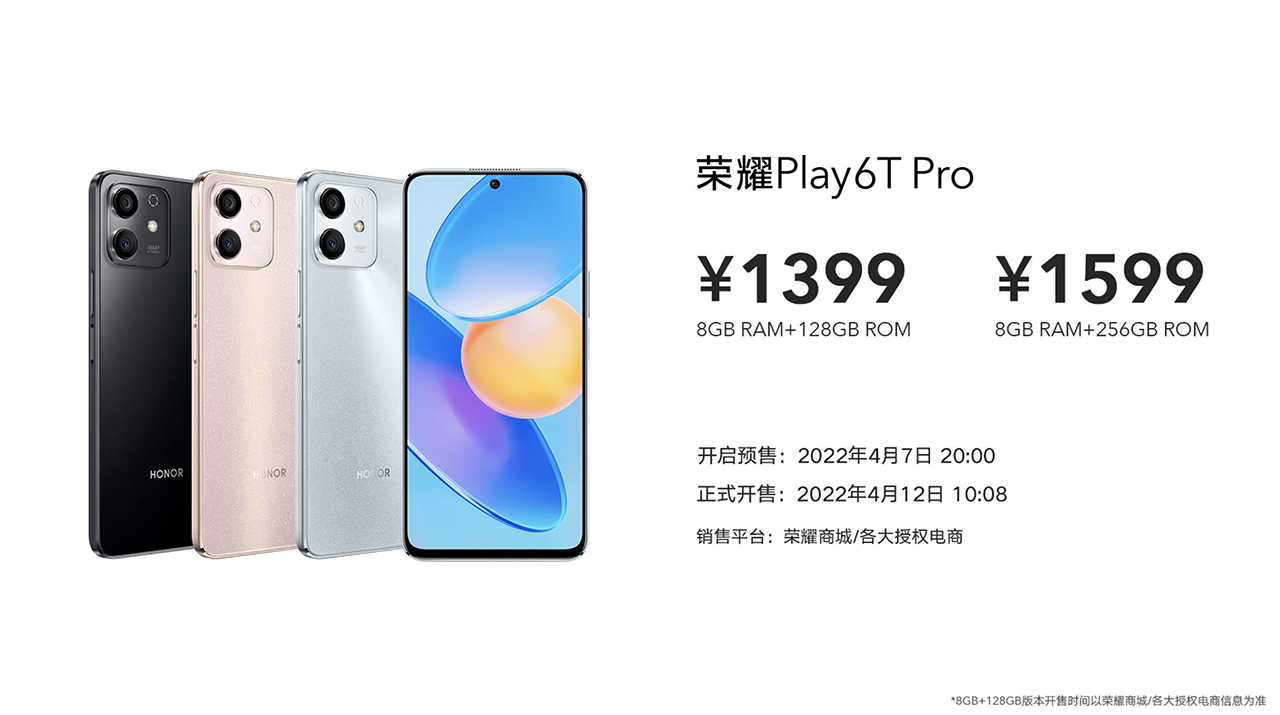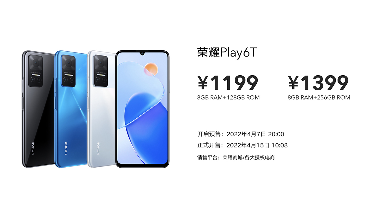 荣耀Play6T提供幻夜黑、魅海蓝、钛空银三种配色,8+128GB版本售价1199元,8+256GB版本售价1399元,4月15日正式开售。