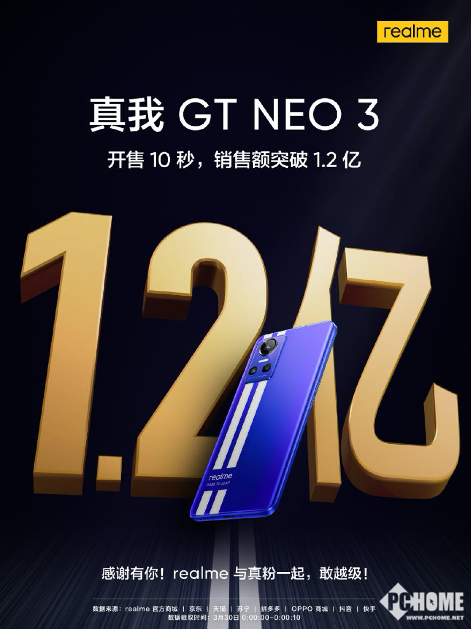 31日上午,真我公布了GT Neo3的首销战报:10秒销售额破1.2亿,开售10小时全渠道销量突破10万台。作为爆款系列,真我GT Neo首销全渠道销量突破10万台,真我GT Neo2全渠道实现销售额1秒破亿,真我GT Neo3继承了爆款基因,以首销10万台的战绩成为新一代销量爆款。