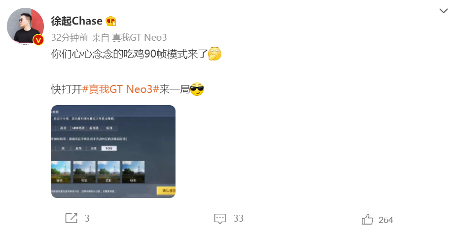 2022年4月12日下午,realme副总裁、中国区总裁、全球营销总裁徐起在微博爆料称,真我GT Neo3现已支持《和平精英》的90帧模式。