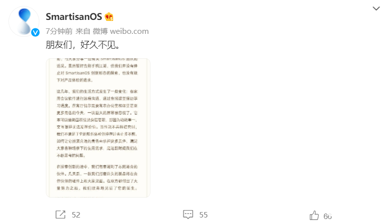 2022年4月15日,SmartisanOS团队在微博发布消息称“朋友们,好久不见”,表示即将回归,未来会推出一款新品。