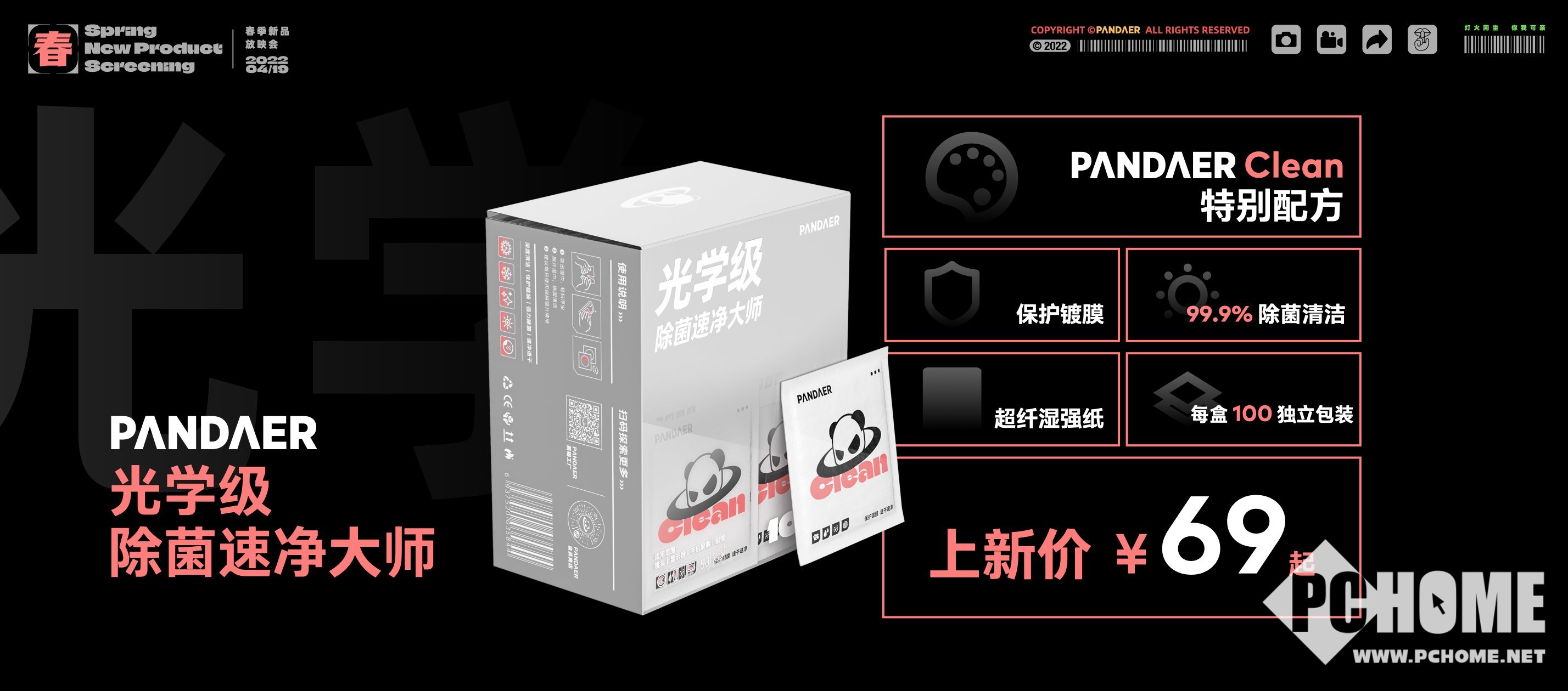除了手机硬保护产品,日常维护保养产品也正式登场。 PANDAER 光学级除菌速净大师拥有为镜头、眼镜、屏幕等光学设备清洁的能力,同时也能为光学镀膜提供极为出色的清洁与保护方案,PANDAER Clean 清洁液的加入,既能保证对光学设备的清洁除菌能力,也能发挥其出色的速干表现,让水渍无法残留产生,配合十分柔韧的超纤湿强纸,除污更彻底,保护更高级。
