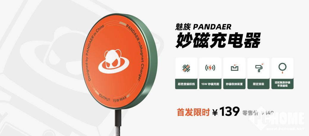 上新部分,PANDAER 潮电在这次魅族春日新品放映会上带来了一款时尚个性且兼顾轻巧便携的 PANDAER 15W 妙磁充电器,它同时适配魅族妙磁与苹果磁吸生态,拥有超密度编织线与更大胆的配色设计,首发优惠限时 139 元,于月内开售。