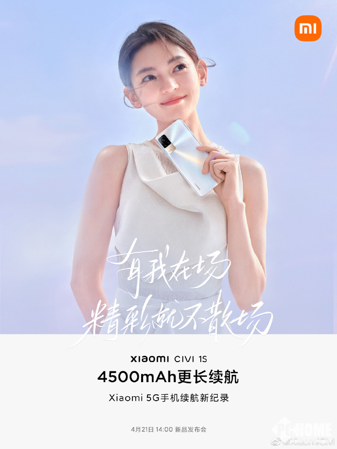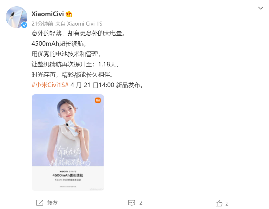 2022年4月20日下午,小米官方发布消息称,新产品Civi 1S将搭载4500mAh电池,通过电池技术和管理让整机续航再次提升至1.18天。值得注意的是,这也刷新了小米5G手机续航新纪录。