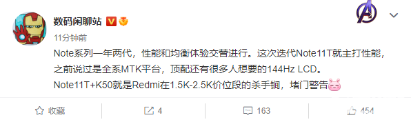 随后,知名爆料博主 @数码闲聊站 发布消息称,Redmi的新机可能会被命名为Redmi Note 11T,全系都将搭载联发科芯片。此外,@数码闲聊站 还表示,Redmi Note 11T的顶配版本或将配备144Hz超高刷新率的LCD屏幕。