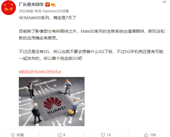 近日,数码博主 @厂长是关同学 发布消息称,华为Mate 50系列确定7月问世,除了影像部分有所期待外,Mate 50系列的全新系统也值得期待,新玩法和新的应用很有意思。不过遗憾的是,华为Mate 50系列依然不支持5G网络。