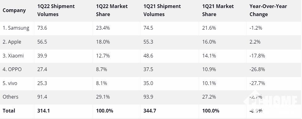 根据统计机构IDC的最新数据显示,2022年Q1季度全球手机市场出货3.141 亿部,出货同比下降8.9%,比2月份的预期数据还低了3.5%,这已经是全球手机市场连续第三个季度的出货下降了。