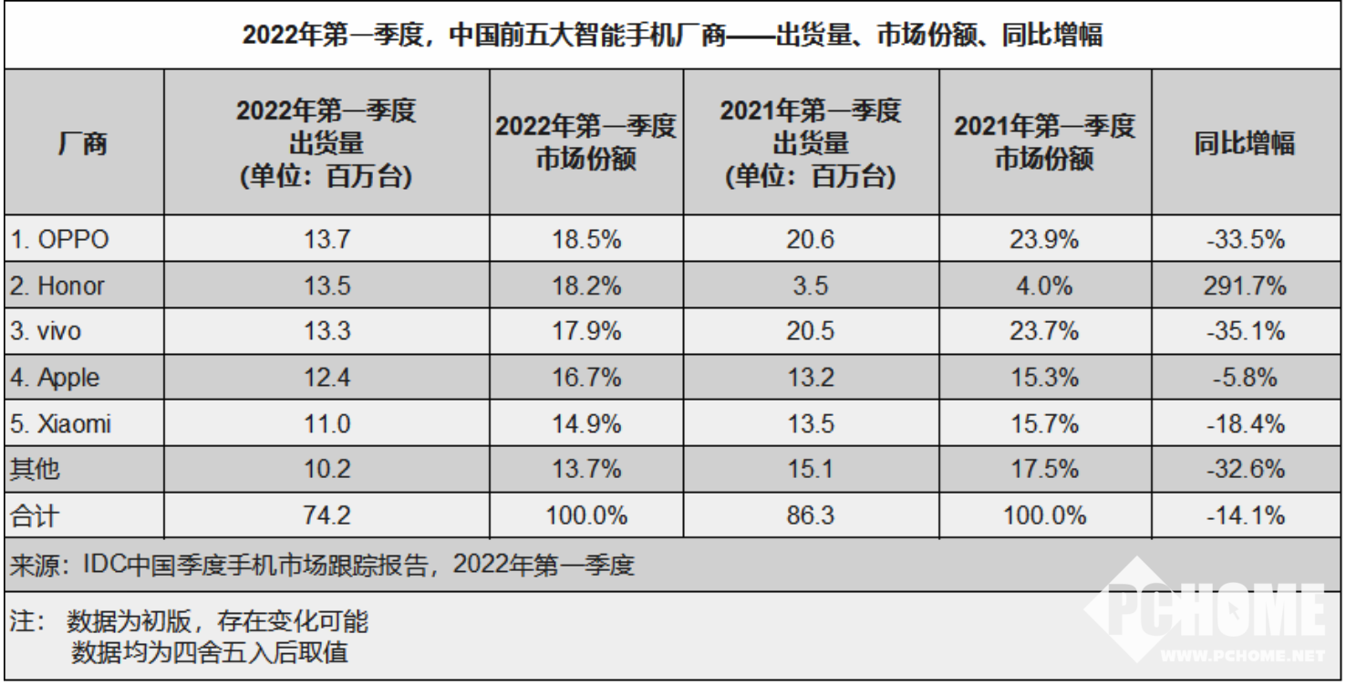 将目光放在国内市场的话,市场份额的排名则会发生明显变化。OPPO以1370万部的销量占据了18.5%的市场份额,成为Q1季度国内市场的头号品牌。荣耀、vivo、苹果、小米紧随其后。